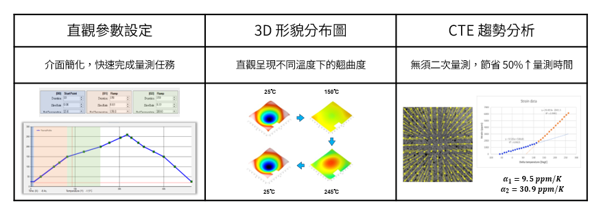 INSIDIX熱型變量測儀適用於各領域的產品,主要提供產品在不同溫度下的:熱型變翹曲度(Thermal Warpage)、熱膨脹係數(CTE)量測結果。
