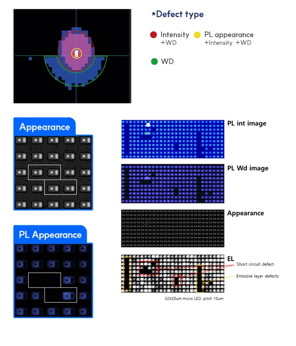 一次扫描就能将micro LED的外观检查、PL(PL强度、PL显示)和色差分析、WD(Domain Wavelength)、xyY完成。