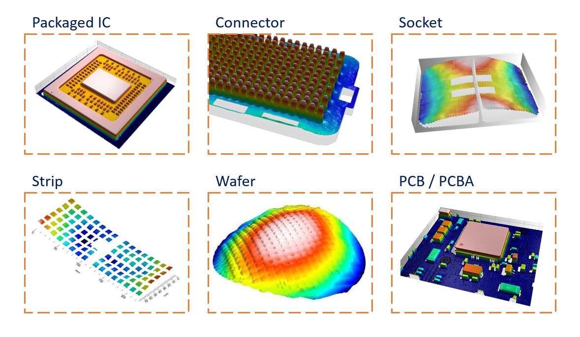 INSIDIX熱型變量測儀適用於各領域的產品,主要提供產品在不同溫度下的:熱型變翹曲度(Thermal Warpage)、熱膨脹係數(CTE)量測結果。